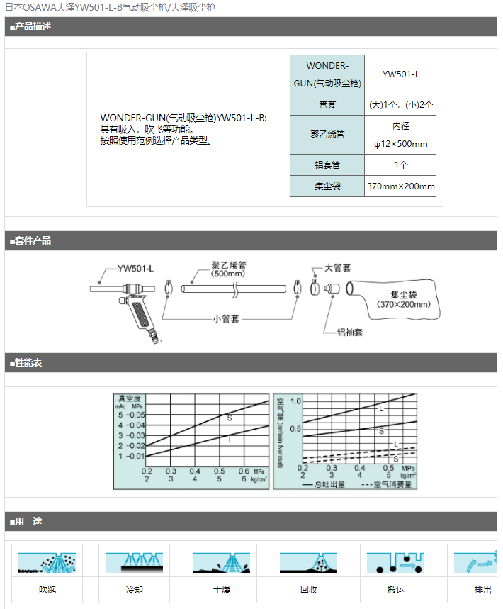 日本OSAWA大澤YW501-L-B氣動吸塵槍