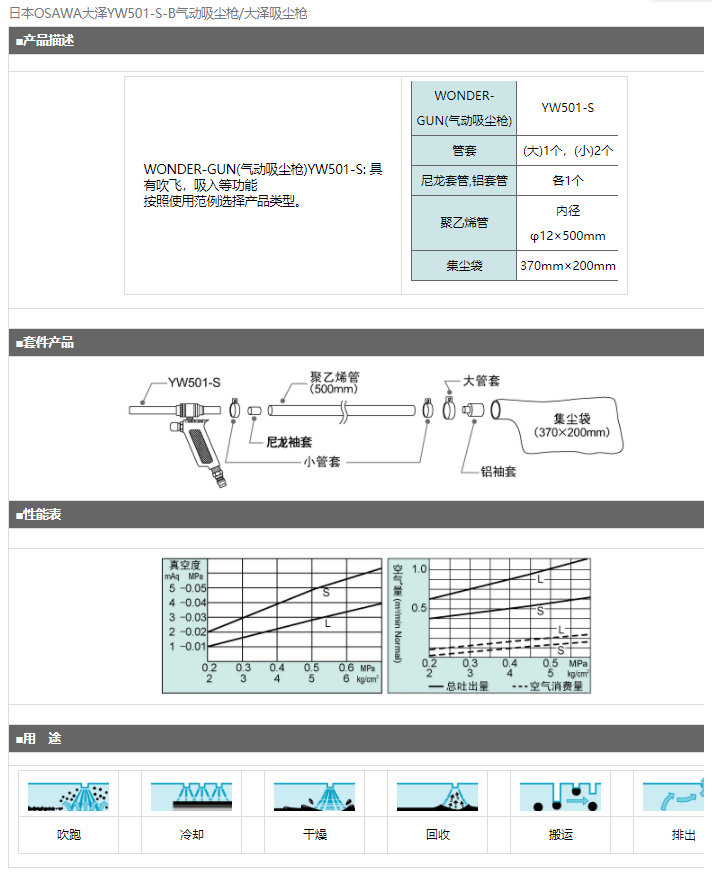 日本OSAWA大澤YW501-S-B氣動吸塵槍