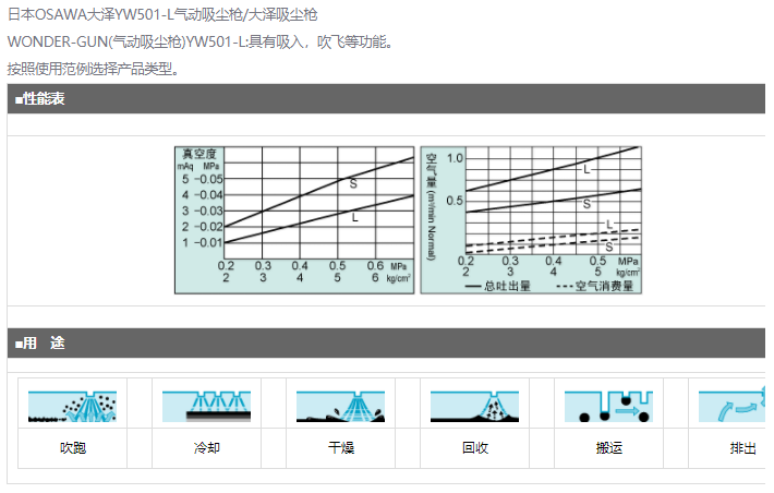 產(chǎn)品簡介: 日本OSOWA大澤YW501-L氣動吸塵槍/大澤吸塵槍 WONDER-GUN(氣動吸塵槍)YW501-L:具有吸入,吹飛等功能。 按照使用范例選擇產(chǎn)品類型。