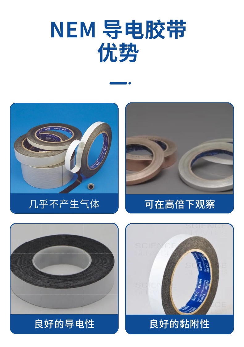 用于密封EMI屏蔽室,殼體和電子設(shè)備的接縫,纏繞電纜進(jìn)行屏蔽,提供可靠的接地表面,對不能焊接的表面提供電接觸,日新雙面碳導(dǎo)電膠帶是專門為掃描電鏡具有良好的黏附性和不可辨結(jié)構(gòu),是觀測整個樣本的理想背景基片。
