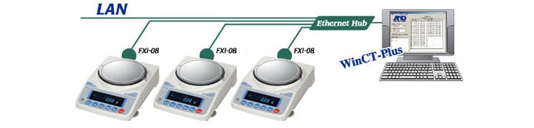 通過使用以太網(wǎng)接口(FXi-08,另售),可以與局域網(wǎng)上的計算機進行雙向通信,并且可以將來自多臺天平的數(shù)據(jù)導入一臺計算機。