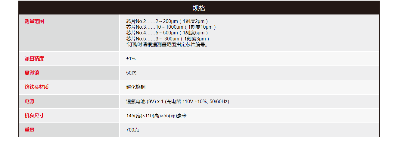 規(guī)格測量范圍芯片No.2……2~200μm(1刻度2μm)芯片No.3……10~1000μm(1刻度10μm)芯片No.4……5~500μm(1刻度5μm)芯片No.5……3~ 300μm(1刻度3μm)訂購時(shí)請(qǐng)根據(jù)測量范圍芯片編號(hào)。測量精度±1%顯微鏡0次烙鐵頭材質(zhì)
